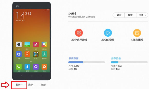 除了可以直接在MIUI 6手机中截图外,还可以将小米手机连接电脑,然后在电脑中下载安装小米手机助手,待小米助手识别到小米手机后,在小米助手界面中,就可以看到“截屏”选项了,点击该项就可以截图,如下图所示。
