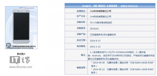 现在,传说中的低配版小米4现身工信部网站,从网站公布的信息来看,低价版小米4的内存从3GB降到2GB,其他信息并没有显示,但据传低价版小米4除了内存缩水之外,其他配置不会有变化,依旧搭载高通骁龙801的2.5GHz处理器,1300万主摄像头+800万前置摄像头。