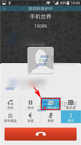 2)当华为P7处于通话状态的时候,点击右侧【更多】,然后点击【录音】即可对当前通话进行录音。(如下图)