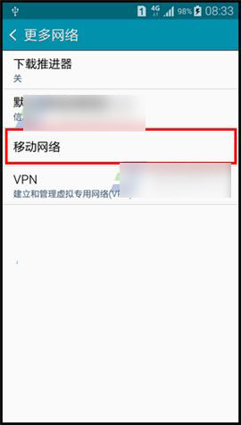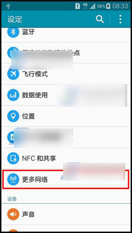 1)打开三星Note4的【设定】,选择【更多网络】,然后选择【移动网络】。(如下图)