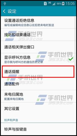 2)点击【通话】,再点击【通话提醒】。(如下图)