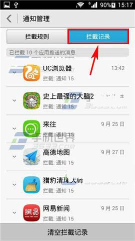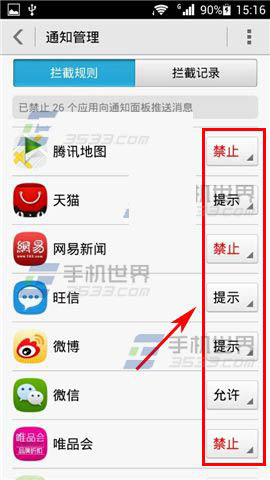 2)在该页面就可以对所有应用进行通知管理,有【允许】【禁止】【提示】以供选择,不想接受通知栏消息推送的应用直接设置成【禁止】就可以了。如需查看拦截的记录就点击右上角【拦截记录】查看。(如下图)