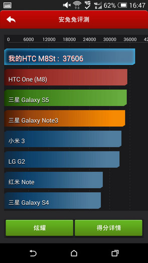 HTC One时尚版配备一枚高通骁龙801四核处理器,具体型号为8974AC,主频高达2.5GHz,GPU为Adreno 330,高通骁龙在4G/LTE及64位处理器行业中处于领先地位,与之匹配的是2GB运行内存。在安兔兔性能测试中,One时尚版的成绩超过了3.7万分,而在鲁大师性能测试中,One时尚版的跑分成绩接近3.5万分,在衡量图形处理能力的NenaMark2 V2.4测试中,One时尚版交出了58.8fps的成绩,整体性能与One M8相差不多,足以确保高负荷应用流畅运行。HTC One 时尚版搭载基于Android 4.4.2版本的定制系统,采用最新的HTC sense 6.0界面,图标具有扁平化的风格,操作起来得心应手。