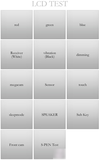 上面三行是:红、绿、蓝;第二行:白色、振动测试、调光;第三行:摄像头、传感器、触摸。基本上测试完就完事了。