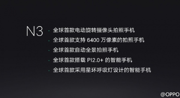 OPPO今天在北京和新加坡两地同步举办发布会,推出旗下新款旋转镜头机型OPPO N3。N3采用全新的电动式镜头设计,同时还加入了按压式指纹模块。同期亮相的还有全球最薄手机OPPO R5和Lifestyle系列音频产品。其中OPPO N3售价3999元,OPPO R5售价为2999元,预计11月底正式上市