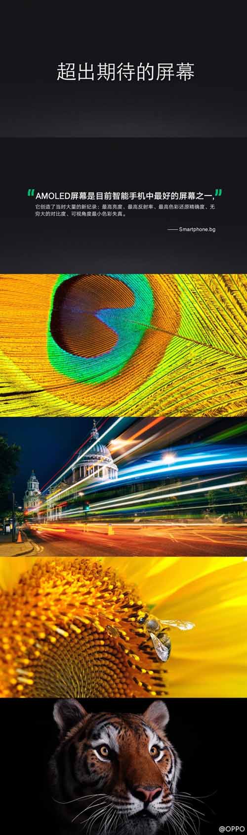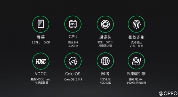 OPPO R5采用5.2英寸1920×1080像素全高清AMOLED屏幕,搭载64位高通骁龙615八核处理器(big.LITTLE大小核结构),内置2GB运行内存。R5后置1300万像素镜头为索尼IMX214。