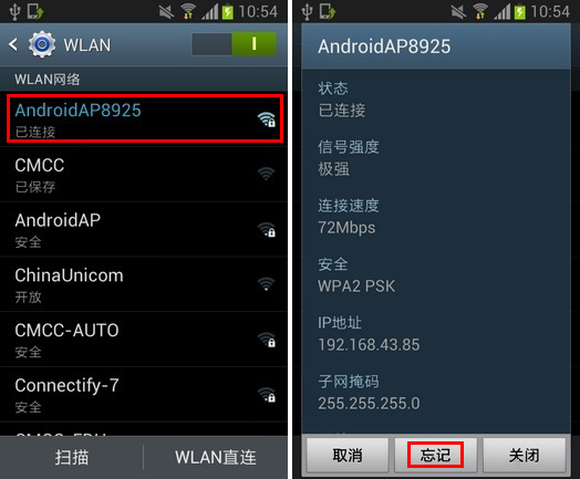 6.如您之前连接过其他无线设备可以,但连接现在的无线设备不可以,建议您先“忘记”之前的无线设备设置,再搜索新的无线设备重新输入密码连接。