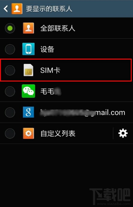 2:只选择“SIM卡”,通讯录就只显示手机SIM卡的联系人。