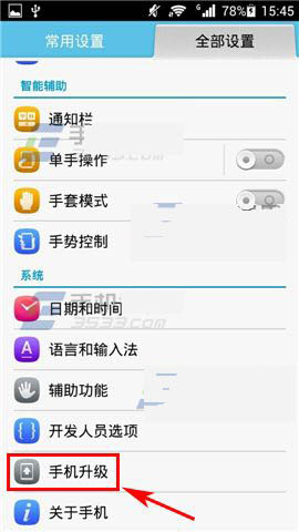 1)打开华为P7的【设置】,点击【手机升级】,然后选择【系统软件升级】。(如下图)