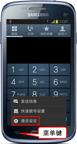 点击手机左下角的【菜单】键,选择【通话设定】。