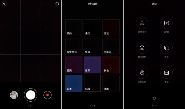 而这一次小米 4 上搭载的 MIUI 6 拍照界面就与以往的有非常大的不同,抛开了 MIUI V5 较为繁琐的拍摄界面,而采用了更为简洁的设计。竖幅构图时,上方只有补光灯和切换前后摄像头的按钮。底部中央是快门键,右边是录像键,左边则是样张回放。向左滑动调出十二款拍照滤镜。向右滑动则是调出 8 种拍照模式,往下拉还有一个手动模式。底部还有一个相机设置按钮,在这里我们可以更改拍照取景的比例和照片质量等。