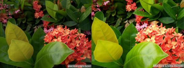 这是上面样张的 100% 截图对比,左边普通模式下拍摄的细节表现尚可,虽然一样有点锐化过度的感觉,但是起码还是清晰的。但是右边的 HDR 模式则出现了难看的重影现象,这应该是因为 MX4 的 HDR 模式拍摄的几张原始照片相隔时间过长有关的。