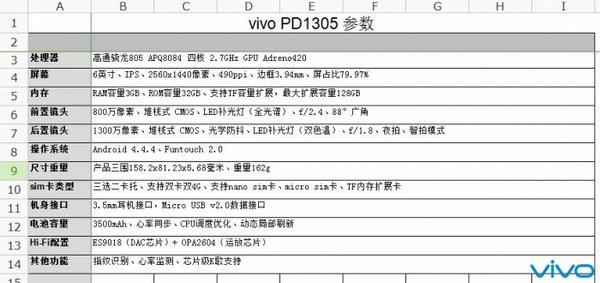 继全球最薄手机X5Max L曝光之后,现在又有一款旗舰级的vivo新机曝光了,据说它是Xplay 3S的继任者Xplay 5S。从网友曝光的规格表来看,vivo新旗舰的代号为PD1305,采用6英寸2560×1440分辨率显示屏,边框为3.94mm,屏占比达到了79.97%。搭载骁龙805四核2.7GHz处理器(APQ8084),内置3GB内存和32GB机身存储空间,还支持最高128GB的Micro SD卡扩展。
