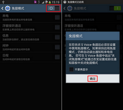 点击【免提模式】右侧的滑块,屏幕上显示提示信息,阅读完毕后,点击【确定】。