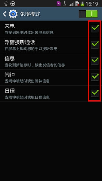 在免提模式中,当有未接来电、信息和通知时,设备将大声读出内容,因此开车时也可使用设备,而无需用手操作,例如,当来电时,设备将读出呼叫者的姓名后电话号码。若要开启免提功能,请按照以下方法操作(以Galaxy Note3为例):