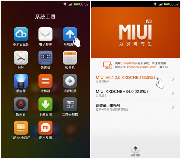 1、点击桌面“系统升级”-->检查更新-->橙色字体新版本(如:MIUI V6.1.2.0.KXDCNBJ 稳定版);