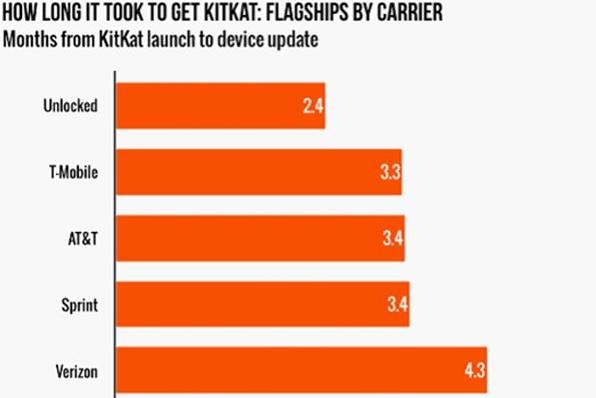 另外一个因素在于运营商,以一张去年的Moto X升级进度图表来举例。在图表中,你会看到不同运营商对于Moto X升级Android KitKat的时间并不一致。相比之下,显然无锁版Moto X获得升级的速度是最快的,Verizon版Moto X则是最漫长的,而且在运营商这儿,那些非主流的设备升级速度之慢还得加个“更”字。