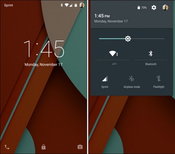 Android 5.0棒棒糖带来了很多极为实用的变化,但方便和安全总是一对不可调和的矛盾,有了这个就必然牺牲另一个。就像现在不少第三方ROM上那样,安卓5.0也可以在锁屏状态中下拉弹出快速设置了,无需解锁就可以调整亮度、开关Wi-Fi和数据、打开手电筒、开关飞行模式。