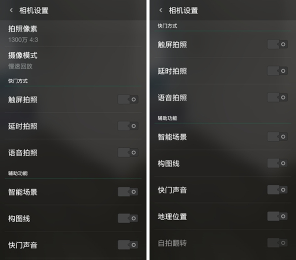 需要说明的是OPPO R5的系统是升级之后的Color OS 2.0系统,使得PI 2.0的原话引擎不仅仅是在硬件规格上面有提升,还在软件操作方面也得到改善。用户可以发现OPPO R5已经把各种拍照效果和功能做成了插件,方便用户添加和减少,提升了用户体验效果。OPPO R5的拍照界面非常简洁,方面大家上手,在设置界面中,具有快门方式、辅助功能,快门方式等功能,还包括触屏、延时、语音三种拍摄方式,在铺助设置界面,用户则可选择智能场景、构图线、快门声音、地理位置、自拍翻转五种常用功能,下图为OPPO R5拍照界面设置截图: