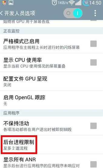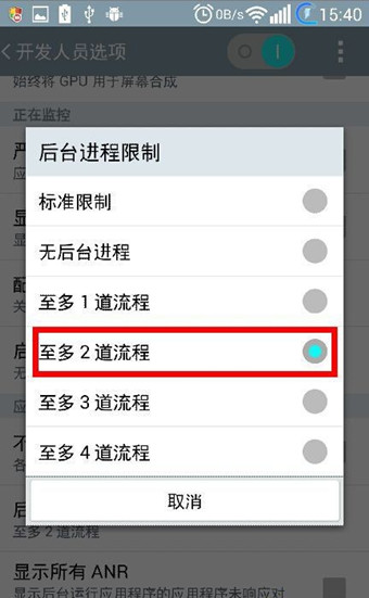 选择“至多2道流程”(选其它的也可以,如果选择无后台进程或至多1道流程,玩游戏可能会有闪退现象)。