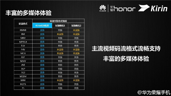 在视频解码这方面,虽然现在有软解,不过相比硬解耗电不少,而在硬解的格式上,麒麟620可谓全覆盖,包括比较旧的RMVB、RM以及小众的MOV(苹果开发的视频格式)等均提供硬件支持,让用户在视频选择上毫无后顾之忧。