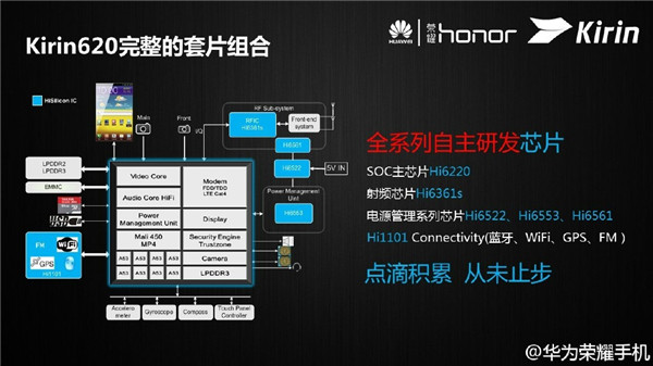 麒麟620主频为1.2Ghz,并基于28nm工艺制造,在保证了性能的前提下,功耗降低了不少,用户最大的感受就是,使用上和其他处理器一样稳定流畅,但是更省电了。