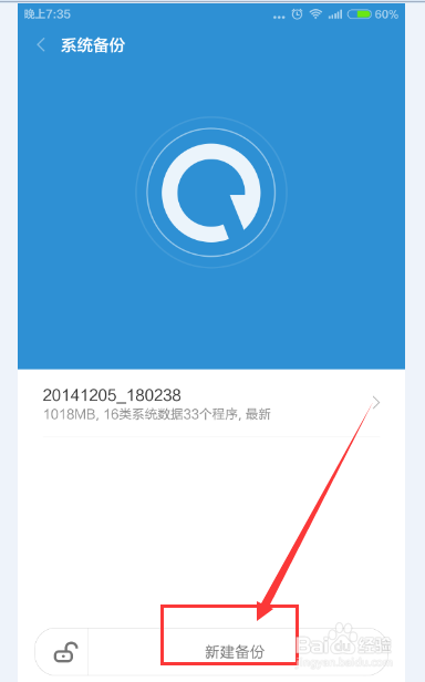 4、 进入【备份和重置】界面点击【本地备份】,接着就进入了【系统备份】界面,然后点击【新建备份】,如图所示:
