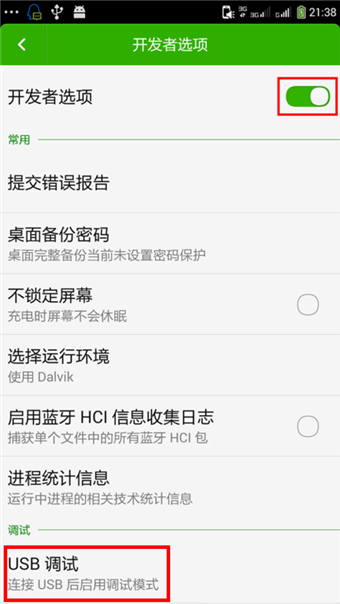 滑动“开发者选项”开关,勾选“USB调试”。