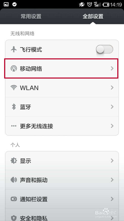 3、进入设置页面之后,我们点击上边全部设置,在找到移动网络的字样进入。