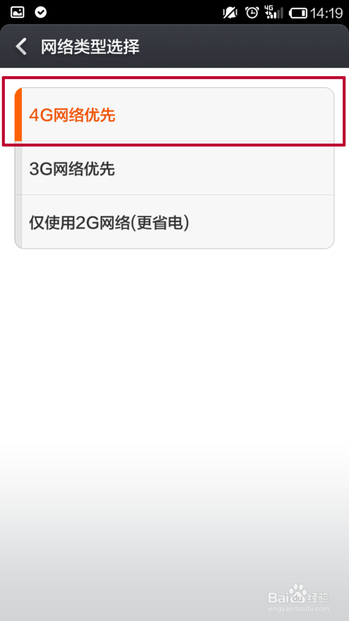 5、我们在网络类型这里,点击4G网络优先,我们稍等一下,右上角就会给我搜索4G信号,就成功开启了