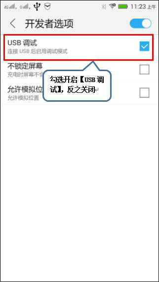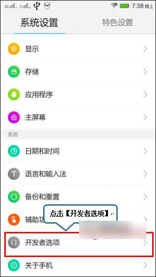 5、然后返回【系统设置】界面,找到并点击【开发者选项】,勾选【USB调试】为开启状态,取消勾选为关闭状态,如下图;