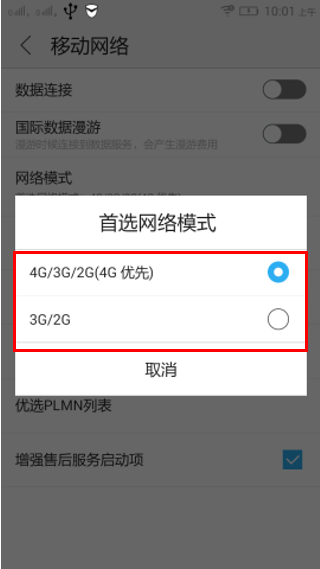 4、在弹出网络模式界面内可点击选择【4G/3G/2G(4G优先)】、【3G/2G】,若选择【4G/3G/2G(4G优先)】,则可使用4G、3G、2G网络模式,优先使用4G网络模式,若选择【3G/2G】则使用3G或2G网络模式,如下图;