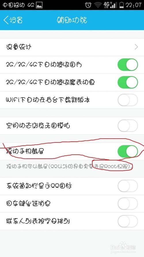 2、打开“摇动手机截屏”注意下方那行文字,QQ以外要获取ROOT权限,小编已介绍过华为荣耀3c 移动4G版获取root的方法,不知道的可以看这个链接http://jingyan.baidu.com/article/76a7e409d93c51fc3b6e1593.html