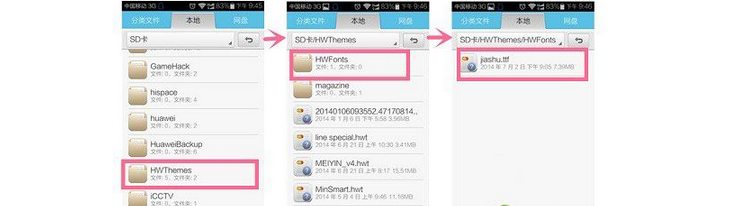 4、下载好了,退出主题,打开文件管理器——内存卡——找到"HWThemes"文件夹(下载的主题、字体等都在这里面)——打开“HWFonts”——就能看到你刚才所下载的字体了(个人下载的是汉仪家书,文件夹就显示“jiashu.tft”
