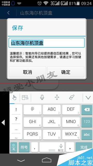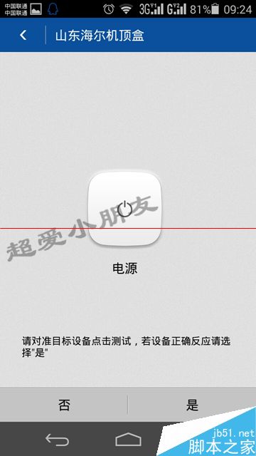 3、把手机上的红外线发射口对准机顶盒,点击手机上的【电源】按钮,看看是否能将机顶盒打开或关闭,是的话点击【是】,不行就点【否】。然后给这个机顶盒起个名字