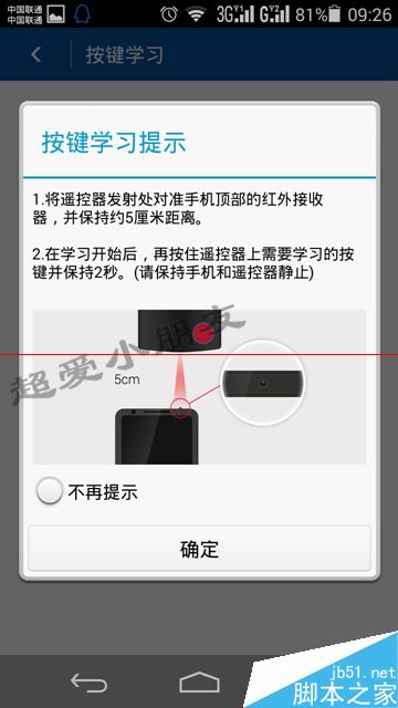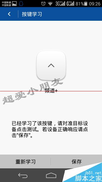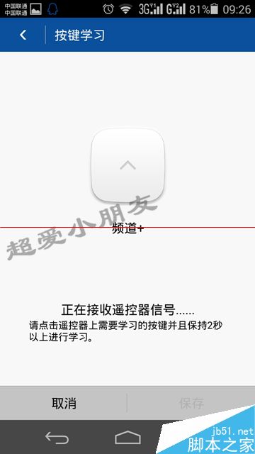 6、以编辑【频道+】按钮为例,按一下手机上的【频道^】,会给出指引提示,此时把机顶盒自带遥控器的红外线发射口对准手机的红外线发射口,按住遥控器的【频道+】按钮,3秒左右,会提示学习完成。