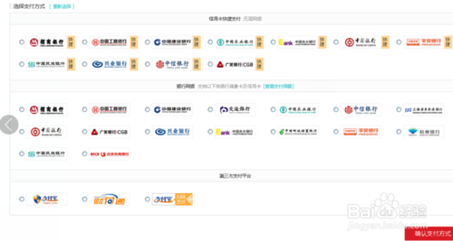 8、点击进行付款,选择任一合适的付款方式,支持的网银和付款平台如下图。