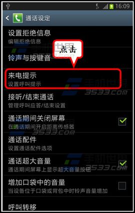 2)点击【来电提示】,选择【通话振动】。(如下图)