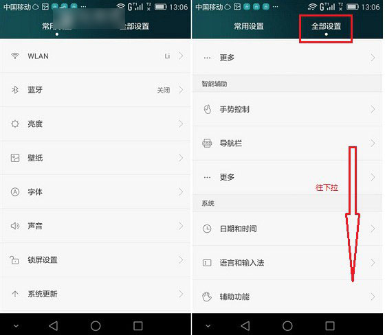 二、进入荣耀6 Plus设置之后,我们再切换到顶部的【全部设置】,如下图所示。