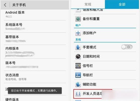 三、在全部设置中,往下拉,然后再点击进入【关于手机】设置。在关于手机设置中,连续点击5-7次【版本号】,当看到“您已处于开发者模式,无需进行此操作”提示的时候,说明开发者选项已经激活,如下图示。