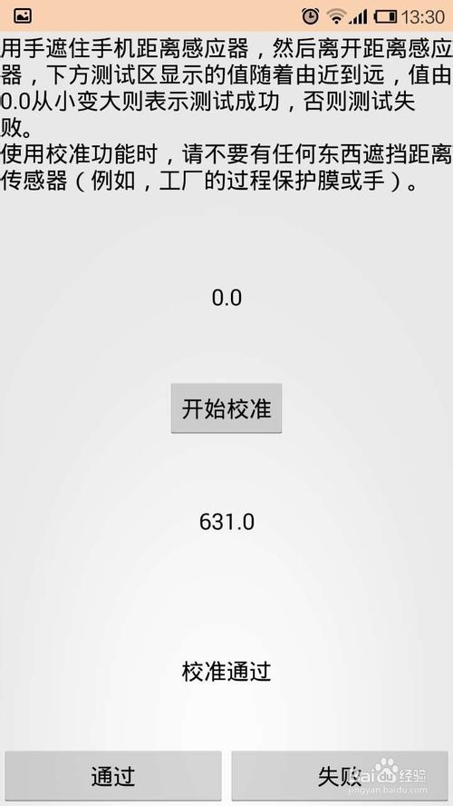 8、点开始校准,校正后用手遮挡住手机距离感应器,然后离开距离感应器,观察下方测试区显示的数值,随着由远到近,数值由0.0从小变大,表示距离感应器可以正常使用了。