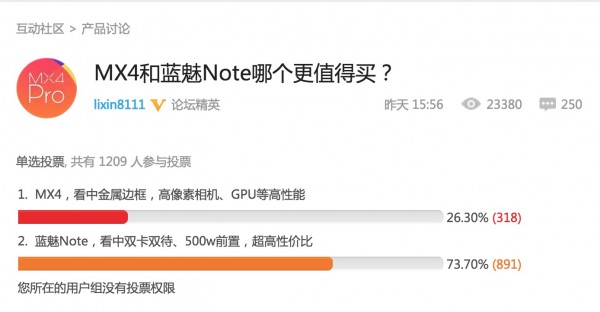 魅族社区展开的投票截止24日16点的结果可以看出,广大用户对这两款产品的相较的初步结果。