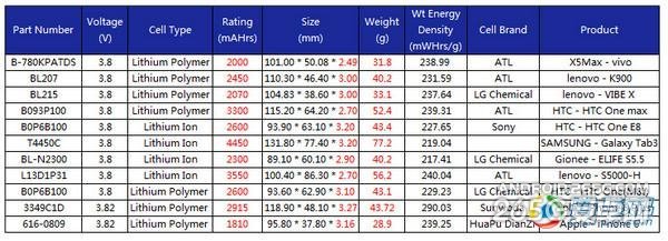 电池厚度也薄于一般手机,约2.50mm,一般手机的厚度在3~5mm这个范畴。也因为这纤薄的厚度,整个电池的容量不大——2000mAh。如下是通过eWiseTech网站旗下的数据库与搜索工具eSeeker摘选的一些市面比较纤薄的智能手机电池的概况列表,可以看出2.49mm的电池厚度是其中最薄的。