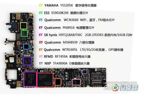 处理器与系统内存PoP堆叠封装是目前手机主板主流的处理方式(为节省主板空间),但是两块芯片叠加之后势必带来主板整体的厚度增加,因此X5 Max没有采取这种方式。主板上的主要IC有,高通MSM8939八核处理器、SK hynix海力士H9TQ18ABJTMC 2GB DDR3运行内存/16GB闪存、高通PM8916电源管理芯片、高通WCN3660 WiFi,蓝牙,FM组合芯片、高通WTR1605L 2G/3G/4G射频收发器、RFMD RF7459A射频信号放大器,值得关注的是X5 Max的音频解决方案,使用到了三颗芯片,分别是雅马哈YSS205X DSP数字信号处理器、ESS ES9018K2M音频解码芯片以及NXP TFA9890A D类音频放大器。