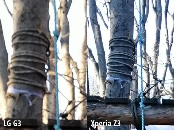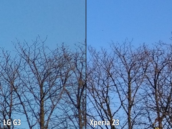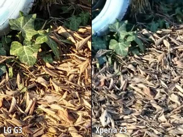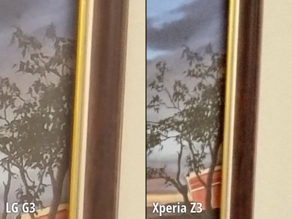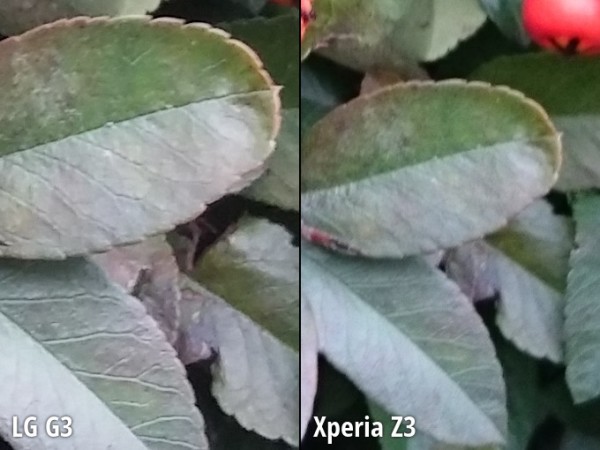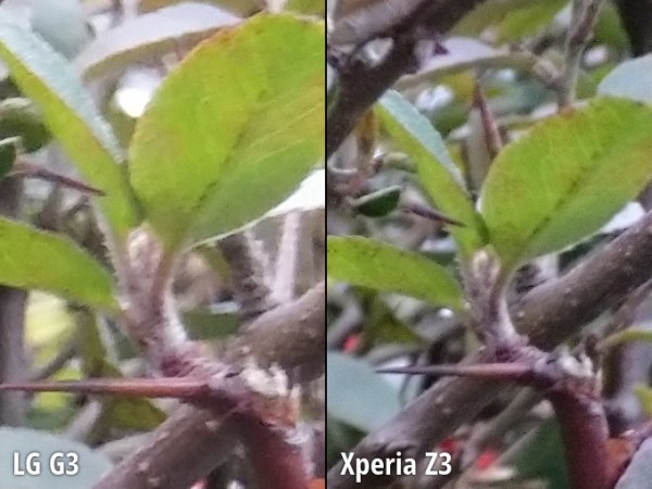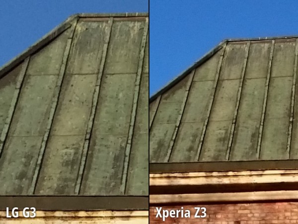 拍摄于同一天,进一步证明两款旗舰在色彩还原和白平衡上的不同。LG拍出的效果更暖色一点,而Z3显得偏冷。通过放大样张能够看到G3能够捕获更多的细节,在阴影上面的表现能力也比Z3强一点。