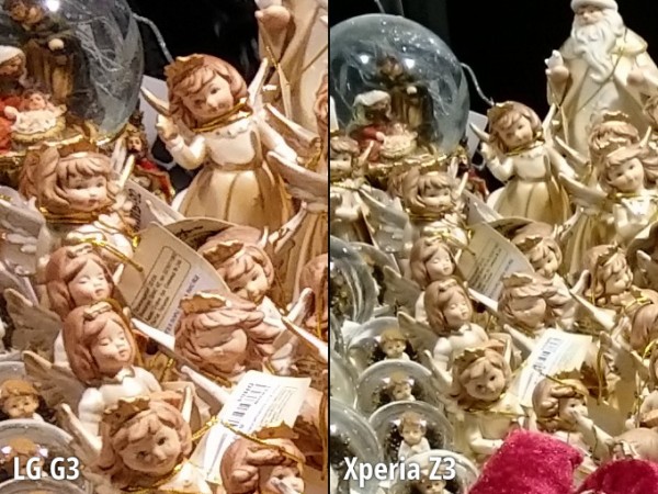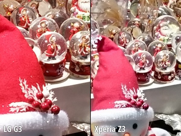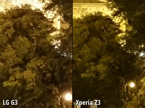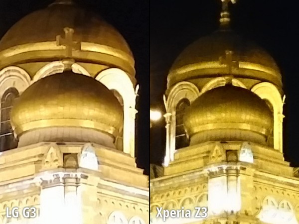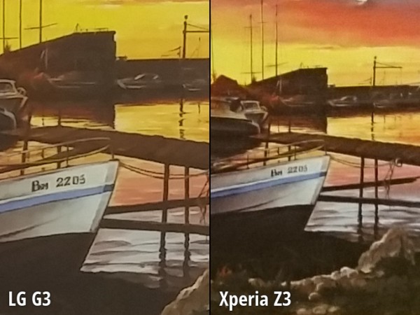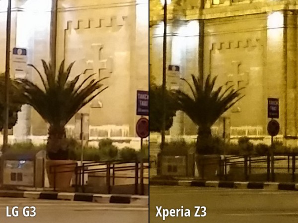 夜晚对于任何相机来说都是重要的挑战.由于索尼Xperia Z3在低光下处理图像的方式导致尽管具备很高的分辨率,但是缺乏细节的表现。LG G3整体上能够拍摄优秀的照片。索尼Xperia Z3并不能非常准确的还原色彩,呈现结果显得有点不太自然。