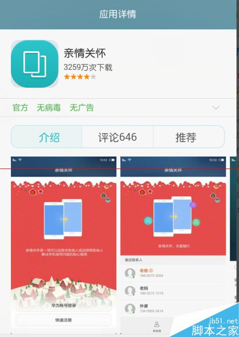 1、首先到华为应用市场里下载并安装【亲情关怀】,给父母的手机上也装上该软件,只要是安卓机就行,不非得是华为的。