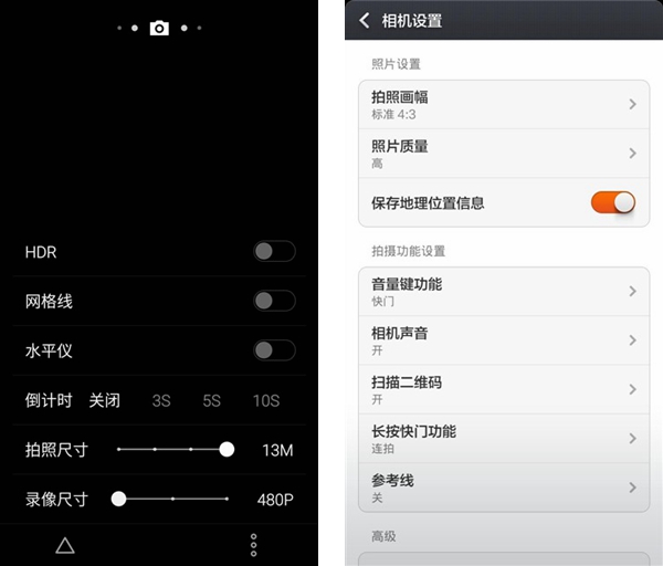 两款手机在拍照设置方面风格不同,图左的魅蓝note打开设置后提供的选项不多,但基本能满足日常使用,上手更加简单。图右的红米note打开拍照设置时直接跳转到常规设置界面,别看是千元机,相机功能比较丰富,虽然这样可以达到更好的自定义拍照,但复杂的操作略显不人性化。从两台手机拍照操作来看完全不同,魅蓝note走简约实用模式,红米note则操作复杂,特别在高级设置方面。