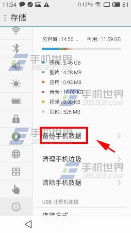 1)进入魅蓝note手机【设置】点击【关于手机】,点击【存储】后选择【备份手机数据】。(如下图)