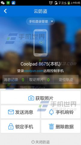 打开酷派大神F2自带的【酷云】点击【云防盗】按钮,第一次使用请行将该功能开启。如手机丢失我们可以用其它酷派手机或者在PC端登陆酷派云,执行定位、获取照片、删除数据、锁定手机等操作。(如下图)
